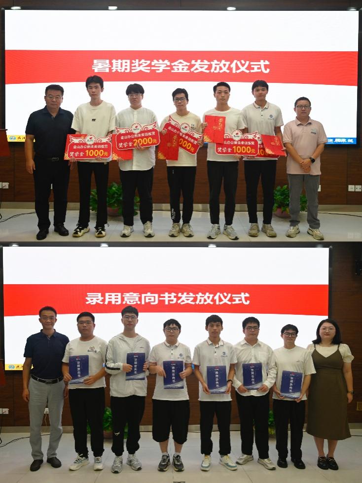 随后,赵衍民处长与武海涛总监为参加金山办公训练营的优秀学生代表颁发金山办公暑假奖学金。史彬副院长与赵志梦经理为通过考核的同学发放金山办公录用意向书。