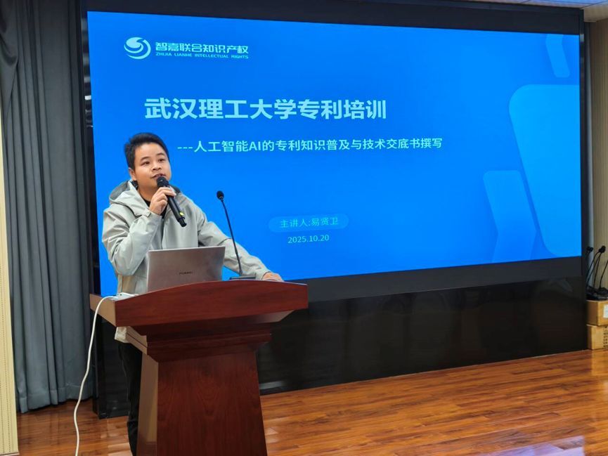 为帮助师生深化对人工智能(AI)专利知识的认知、提升技术交底书撰写水平,2025年10月20日,学院在理工鉴湖校区学海楼510教室成功举办“人工智能AI的专利知识普及与技术交底书撰写”专题培训讲座。本次活动特邀智嘉联合专利代理事务所专利部副主任易贤卫担任主讲嘉宾,吸引了学院大批师生参与。