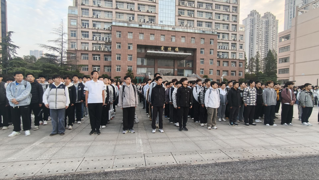 《义勇军进行曲》的雄壮旋律响彻校园,全体师生肃立注目,高唱国歌。嘹亮的歌声凝聚着在场师生的爱国赤诚,鲜艳的五星红旗在晨光中冉冉升起、迎风飘扬。师生们怀着无比崇敬的心情向国旗行注目礼,目光追随着国旗攀升的轨迹,歌声里满含对祖国的无限热爱与美好祝福。