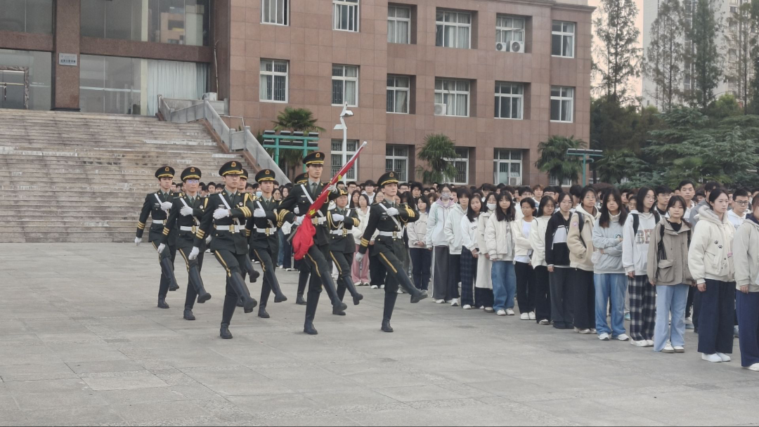 随着分列式音乐的激昂旋律奏响,国旗仪仗队身着制服,肩护鲜红国旗,迈着铿锵有力的正步,踏着晨光坚定前行,每一步都彰显着青年学子的昂扬风貌,稳稳将国旗护送至升旗台,现场氛围庄重而肃穆。