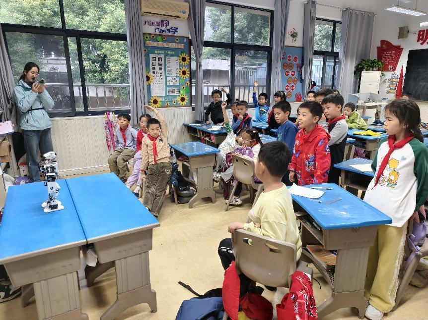 最让同学们期待的机器人实操环节如期而至。志愿者们带来的机器人在讲台上灵活地做出各种动作,前进、转弯、摆臂……每一个动作都引来孩子们的阵阵欢呼。“我来试试!我来试试!”在志愿者的指导下,同学们轮流操作机器人,亲身感受科技的魅力。有的同学小心翼翼地操控机器人完成“绕桩”任务,有的则尝试让机器人跳出指定的舞蹈动作,现场充满了欢声笑语。
