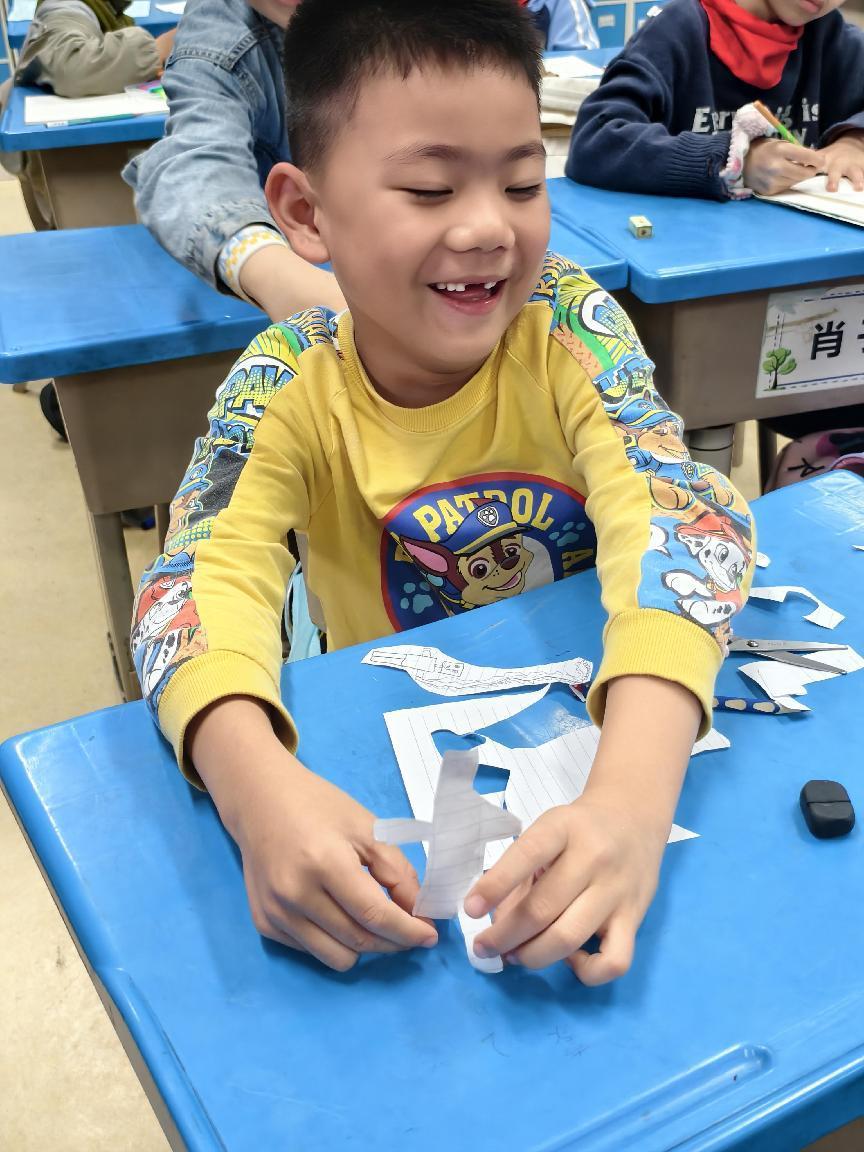 在手工制作环节,同学们用纸张制作简易的机器人模型,在动手实践中进一步理解机器人的结构。一位穿着黄色“汪汪队”上衣的小朋友,拿着自己制作的纸机器人,脸上洋溢着自豪的笑容,他兴奋地向志愿者展示:“姐姐你看,我的机器人能‘走路’呢!”