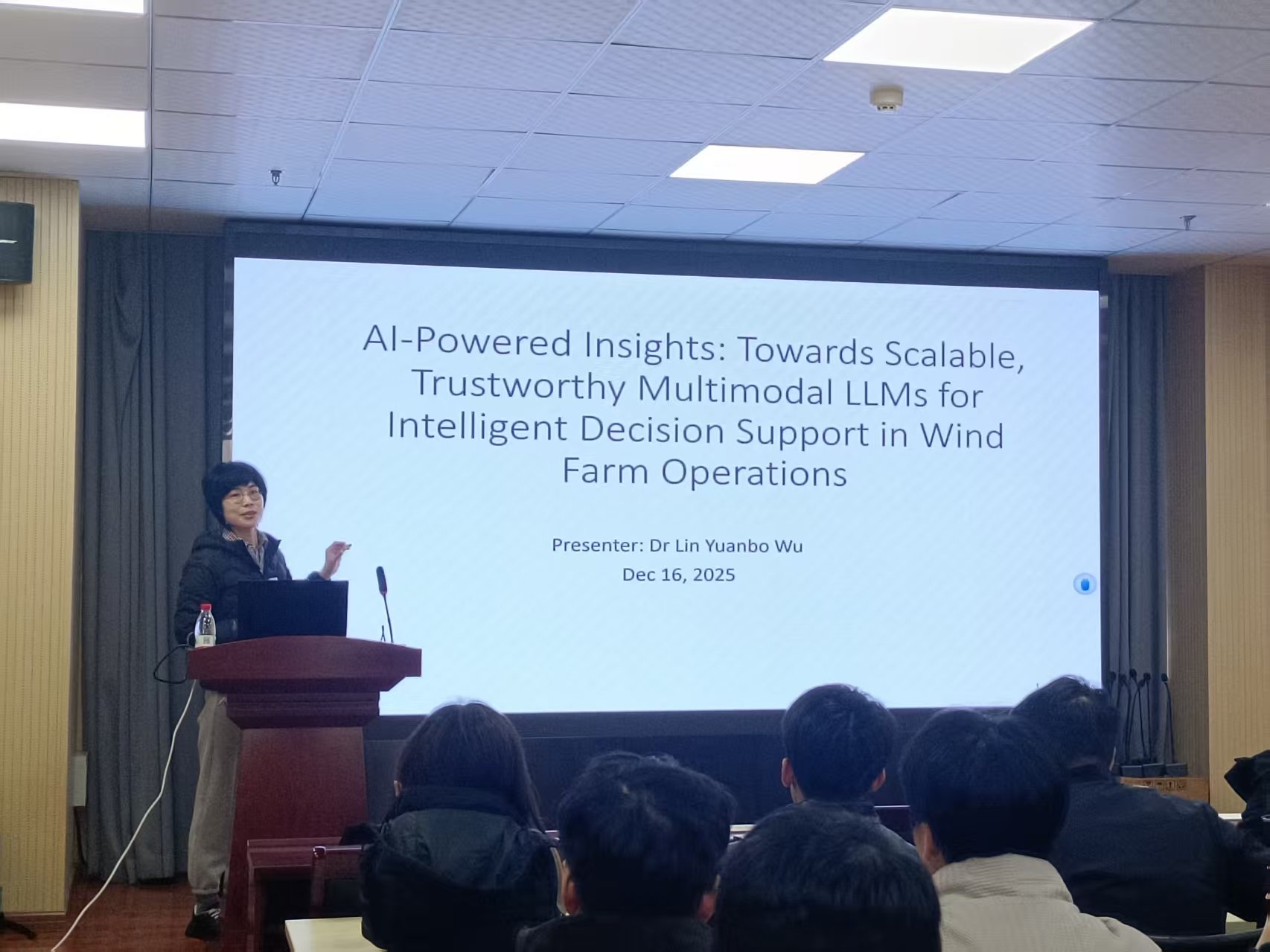 讲座中,武琳教授围绕“大视觉语言模型(LVLMs)研究—ICoNIC方案赋能智能风电场—大语言模型驱动风电场运维”的核心脉络展开分享。她先点明LVLMs作为多源信息整合核心工具的价值,同时指出其效率与可靠性瓶颈,详解了团队“整体剪枝+自适应压缩”的效率优化方案,及动态对比解码机制的幻觉抑制策略;随后介绍ICoNIC方案——这一智能风电场的关键技术,通过结合数字孪生实现“感知-集成”的风电场控制,提升复杂环境下的运营决策精准度;最后提及大语言模型在风电场运维中的应用布局,助力运维模式向智能化转型。
