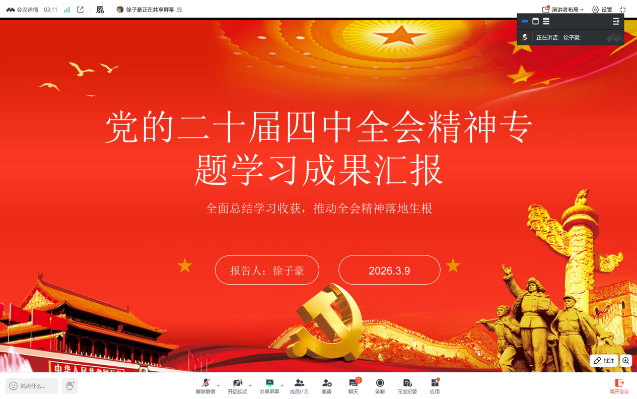 此次线上学习研讨活动,让支部全体党员对党的二十届四中全会精神有了更透彻的理解,进一步端正了学习态度、明确了学习方向、凝聚了学习共识。接下来,党支部将持续深化理论学习,把全会精神学习常态化、长效化,引导全体党员以学铸魂、以学增智、以学促干,深耕学业、奋勇争先,用扎实的学习成绩践行党员初心,为学院学风建设、人才培养贡献青春力量。